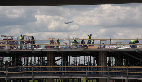 Workers on top of 1325 South Capitol, as seen from the ballpark, with a flight taking off from National at rear. (4/12/12)
