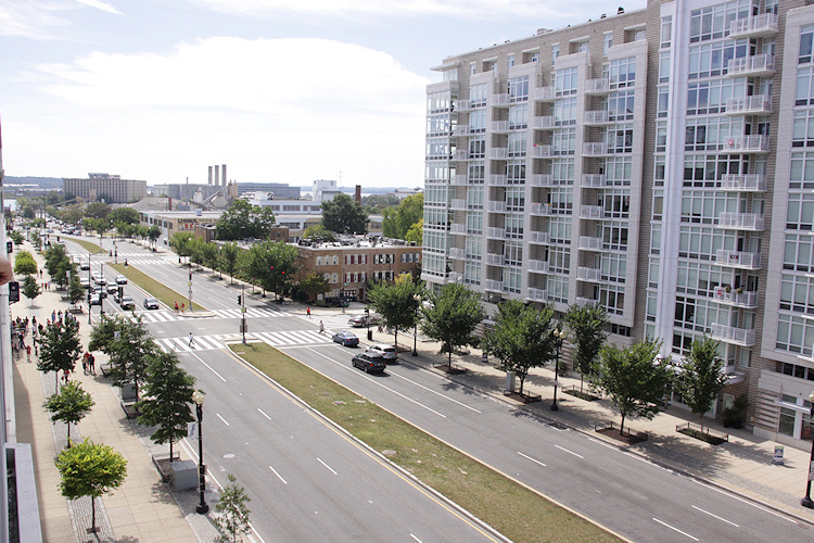 The viewing platforms at the ballpark provide a good view of the 1325 site, seen at right in September 2007, soon after the reopening of South Capitol Street, with streetscape work still underway. (9/07)