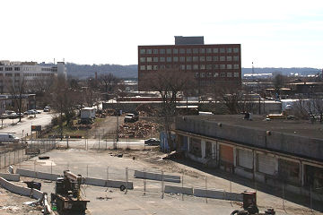 A hard-to-get shot of the 100 I Street lot (in the foreground) as seen from the Southeast Freeway, a few months before demolition began. The land from the freeway to the chain-link fence in the foreground, and to the left of the fence at the left side of the photo, is owned by CSX Rail. (02/06)