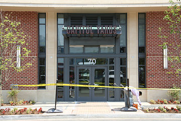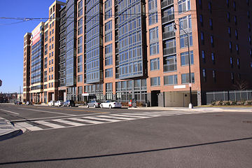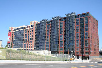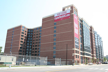 70 I (left) and 100 I (right) are two rental buildings by JPI, on I Street SE between Half and First (seen here from a rooftop two blocks to the south). 70 I, now dubbed "Jefferson at Capitol Yards", has a "warehouse and industrial theme" design, while its sibling 100 I ("Axiom") has a more modern design. Both have rooftop pools, fitness centers, a "resident pub", and concierge service. 70 I started move-ins in June 2008, with 100 I following the next month.