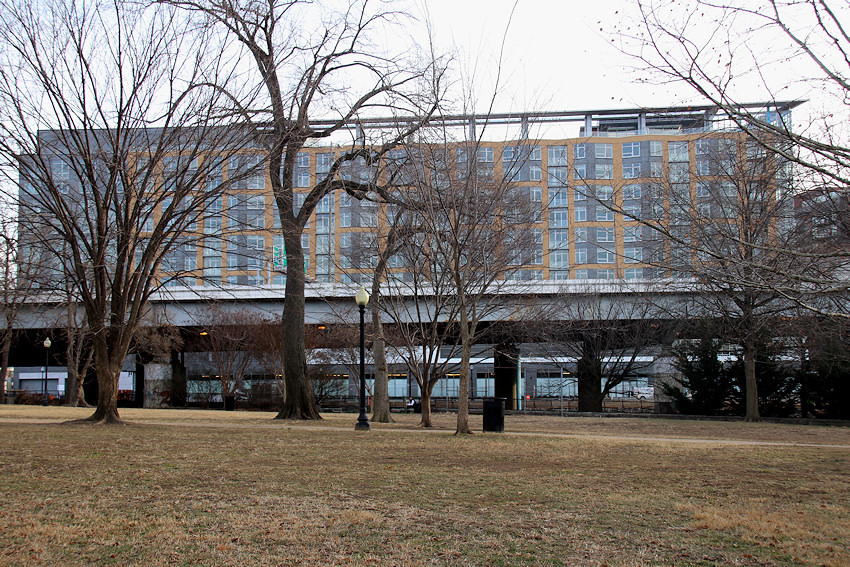 Jan. 22, 2018 - Agora as seen from Garfield Park on the opposite side of the Southeast Freeway, with the Whole Foods space peeking out from underneath.