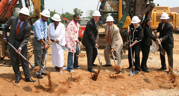 On June 26, 2007, the DC Housing Authority held a ceremonial groundbreaking for the redevelopment of Capper/Carrollsburg, with a large group of people wielding shovels on K Street just west of 4th Street. From left: Brian Allan Jackson of EYA; Franklin Smith, chairman of the DCHA Board of Commissioners; former Capper/Carrollsburg resident Kivette Abraham and her daughter; Ward 6 council member Tommy Wells; Michael Kelly, DCHA Executive Director; Leslie Steen, the District's Housing Chief; Leila Edmunds, director of the DC Department of Housing and Community Development; and Anthony Waddell, Director of Public Finance at the DC Housing Finance Agency. (6/26/07)
