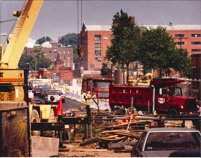 New Jersey and M, and you can also see that M Street itself was merely a bunch of wooden boards (presumably from cut-and-cover construction). Directly to the north of the work site you can see beneath the trees the first of a series of rowhouses that used to stand there (scroll down to the first black and white photo on this page to see them in 1992). Across New Jersey are the