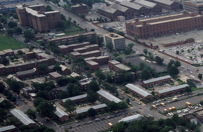 Capper/Carrollsburg public housing project, between K and M and 2nd and 7th. Most of these buildings were demolished between 2003 and 2007. At bottom you can see the school bus lots that eventually became