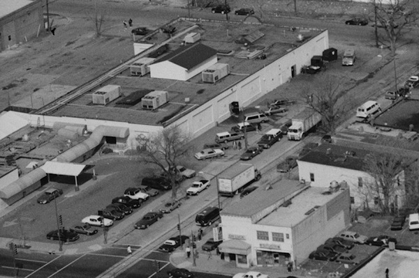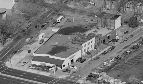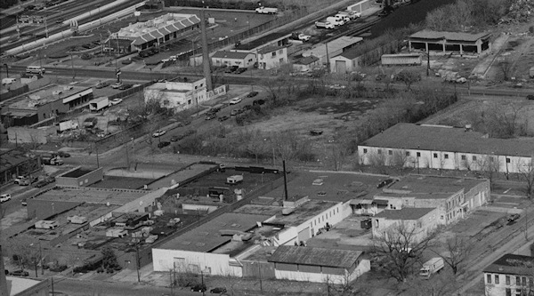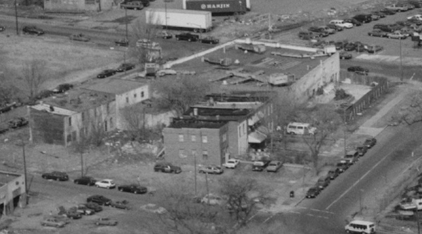 Looking down on what was the Tracks nightclub at 1st and M SE. At right are the outdoor volleyball courts. It was demolished around 1999 to build the 80 M Street office building.