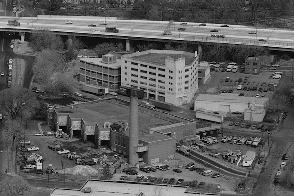 Southeast Federal Center, as seen from the west. The large white building behind the ornate WASA main pumping station is Building 159, which was demolished in the 1999-2000 timeframe despite the desire of historic preservationists to save it. It stood on what is now the footprint of the