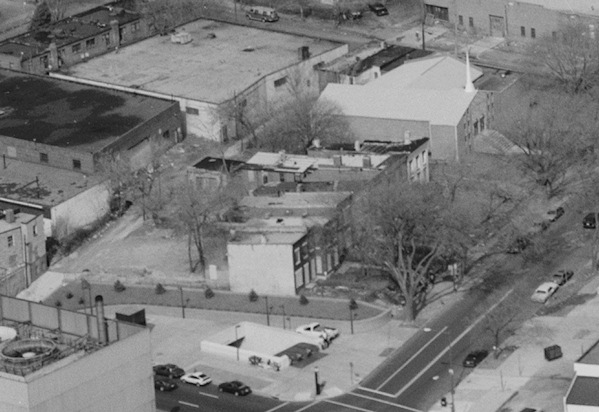 New Jersey Avenue SE at M street, showing mainly the western side of the block. At bottom center is the very tidy and new eastern entrance to the Navy Yard Metro station, which opened the previous year. At least seven townhouses, already boarded up, stand between the station plaza at St. Matthew's Church, at upper right. These townhouses were demolished some time before 2003. (