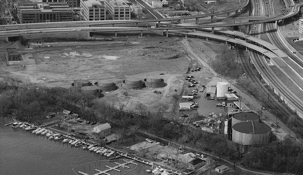 The Washington Gas and Steuart Oil sites on the east end of M Street, bounded by the SE Freeway ramps to Pennsylvania Avenue and the 11th Street Bridges. By 2003 the open field at top center was home to