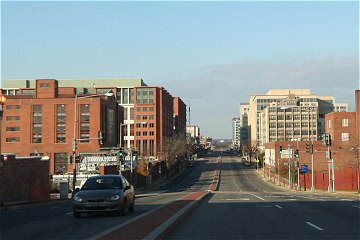 Driving East: The southeast side of M Street, from Half Street toward Cushing and First, in July 2006. The Navy Yard Metro station's west entrance is at far right. The white building in the distance was then home to the National Geospatial-Intelligency Agency; behind it is the