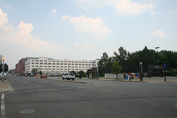 Navy Yard runs along the south side of M Street from this location all the way to 11th Street. If you look closely in the distance you can see the "Blue Castle" building at left and the white Latrobe Gate of the Navy Yard at right. (10/06)