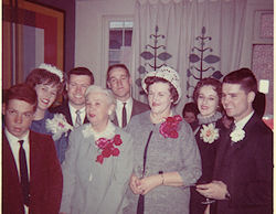 Mom and Dad (2nd and 3rd from left) at their wedding reception on Library Court, SE, with their mothers and three of Dad's brothers. |