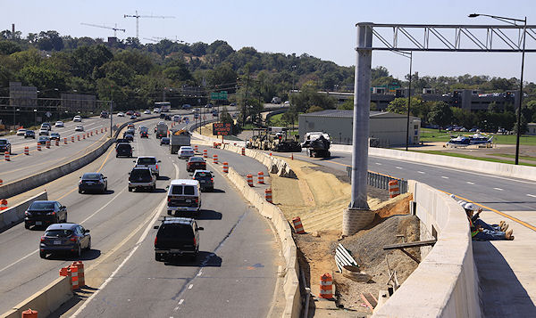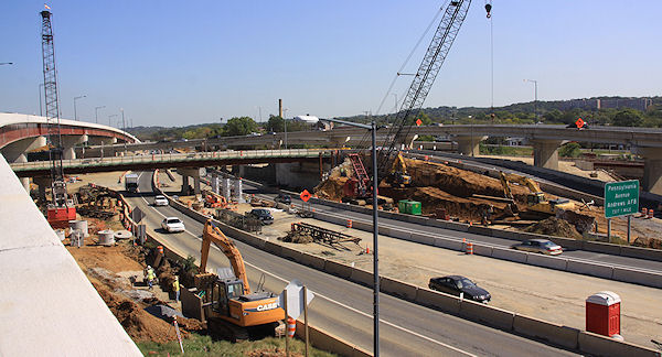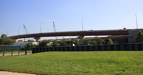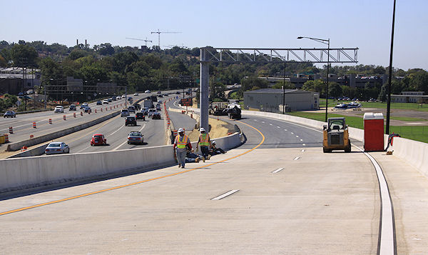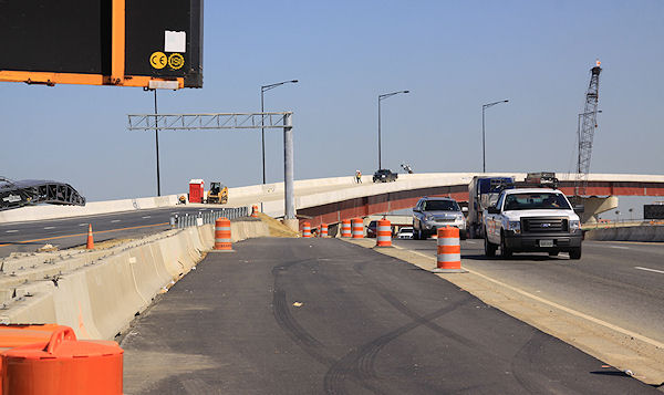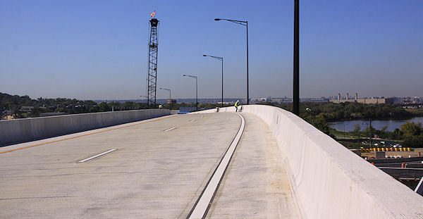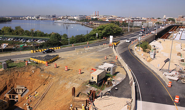 Just as the bridge begins to rise, you can see to its right the beginnings of the eventual new connection between southbound DC 295 and the new inbound 11th Street Bridges. (Yes, you will be able to get right on the 11th Street Bridges and then the Southeast/Southwest Freeway from DC 295 when this is done!)