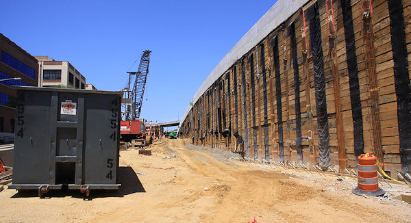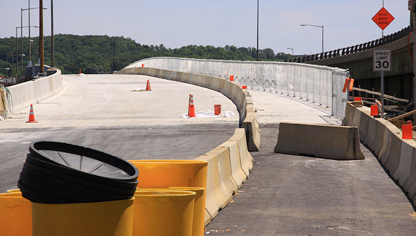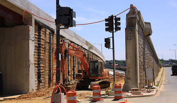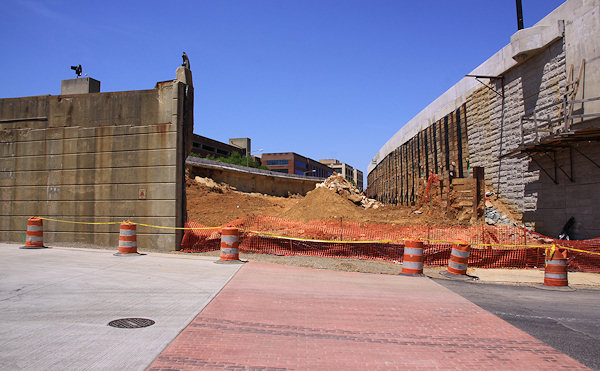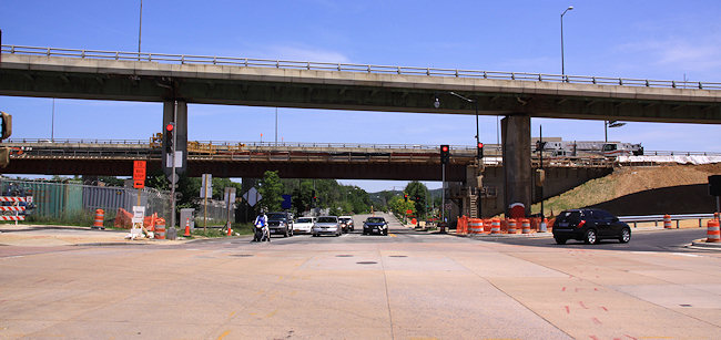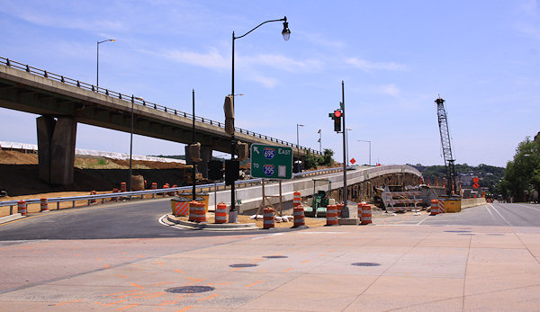 One block to the south, at 11th and N, demolition work is underway (left) while the ramp to the old outbound 11th Street Bridge remains in operation. Soon traffic will be coming northbound through the demolished area to head toward 11th and M, and the ramp will also be demolished to bring 11th Street to its new final alignment and width.