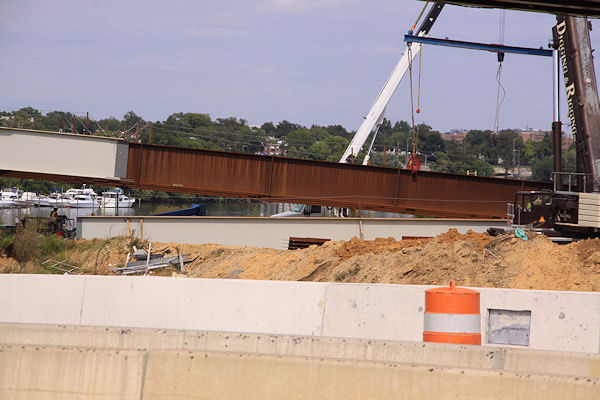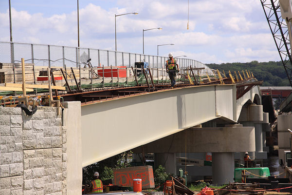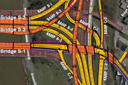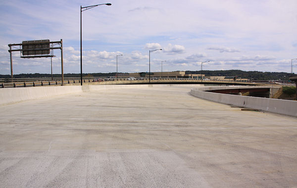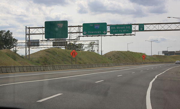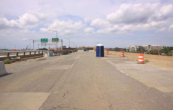 at-grade Southeast Blvd.. The filling in will begin in the distance where you see the grass shoulder, running to 11th Street, seen below in its current bridge format but which will be replaced with an at-grade street, and then onto 13th Street. There will also be a new flyover ramp from the Southeast Freeway to outbound I-695, replacing the flyover seen at top.