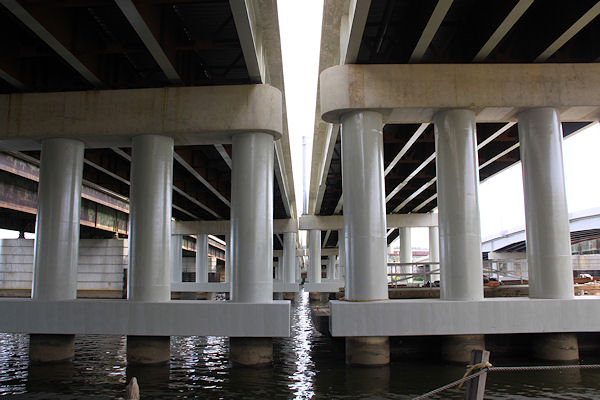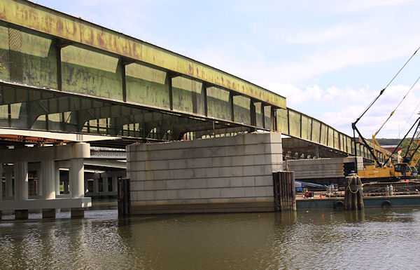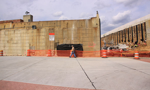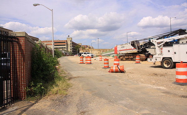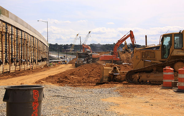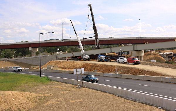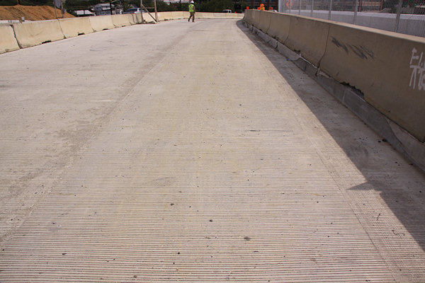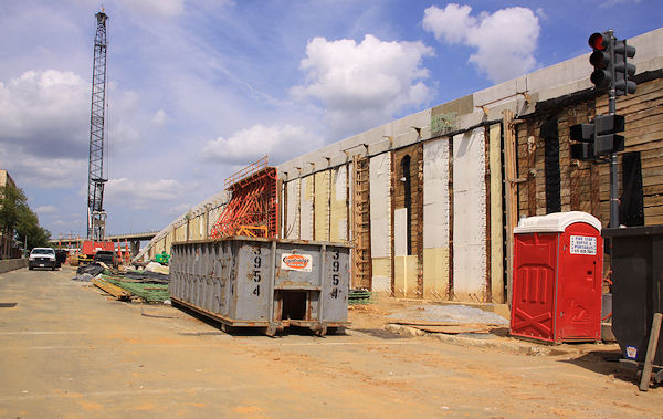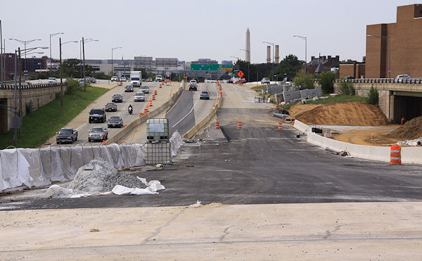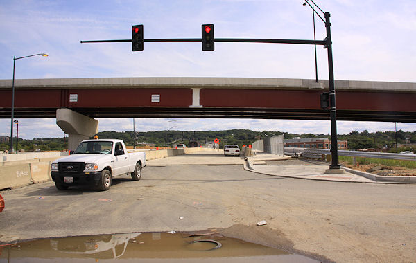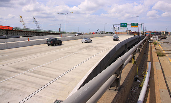 An overhead view rom above 11th Street of the sunken Southeast Freeway lanes. The right lane seen here has already been closed, and by early 2013 all traffic in both directions will be closed to begin work on the