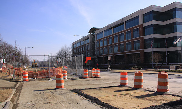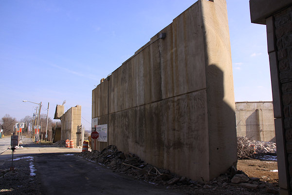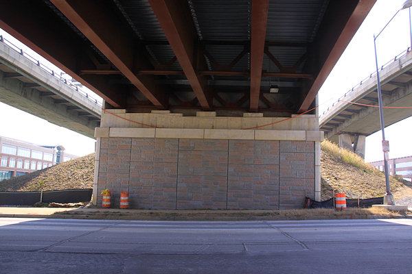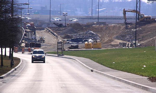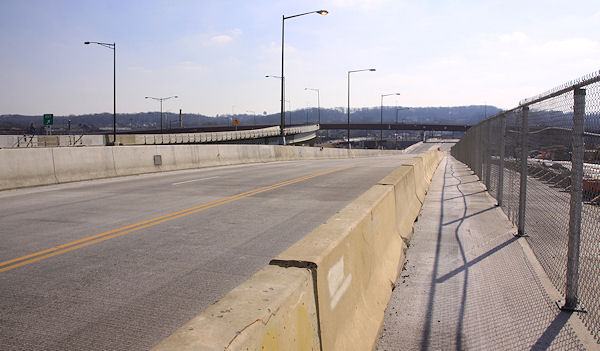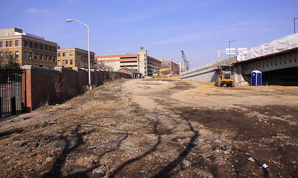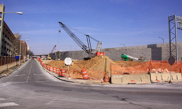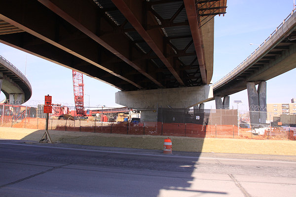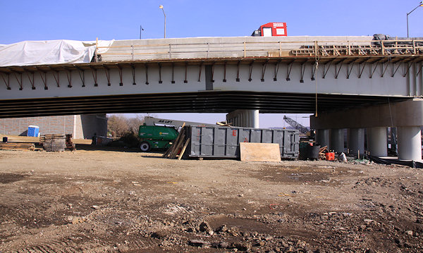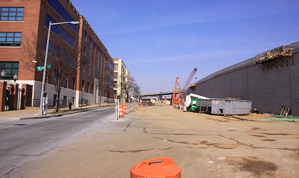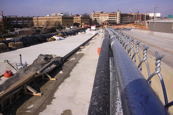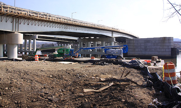 The view of the Anacostia River, Nationals Park, the Navy Yard, and Near Southeast from the 11th Street Local bridge, with construction on the pedestrian path still ongoing. Walkways will be built from this bridge to the two remaining in-water piers from the old outbound bridge to create viewing platforms. (If the 11th Street Recreation Bridge is created, though, it will be directly next to this bridge.)