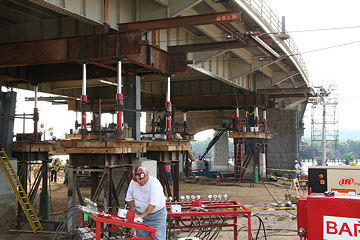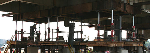 A closer view of the configuration of the jacks and the new columns, one hour into the lowering. (You can see one of the sheared-off old columns still hanging from the bridge in the center.) (7/19/07)