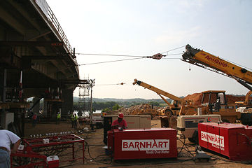 The same angle, seven hours later, and about 90 minutes before the lowering was completed. Look at the silver hydraulic jacks to get a feeling for the amount the bridge has been lowered. (7/19/07)
