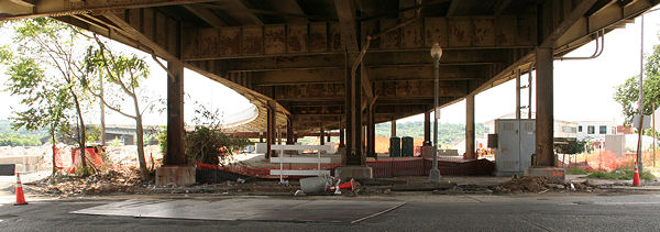 The same location, five weeks after the bridge was closed for demolition and lowering. To see the changes, follow the bridge from the far left in both photos to see how the viaduct is now gone, and the ramp to street level starts much earlier. You can see at left the iron pieces where the new railing will be built--the old green railing at right will also be replaced with a new wrought-iron structure. (The Nationals' administration building is now under construction at rear right, next to the ballpark.) (8/15/07)